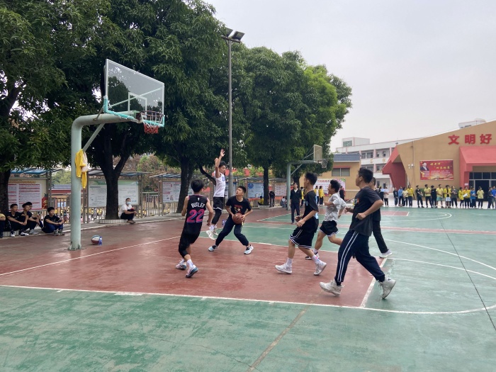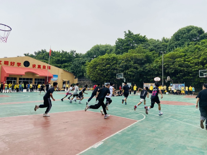 內(nèi)操場(chǎng)正在進(jìn)行的是初中部的籃球賽,參賽隊(duì)員生龍活虎,在場(chǎng)上運(yùn)球、急停、跳投,球進(jìn)了!場(chǎng)上的拉拉隊(duì)立刻爆發(fā)出陣陣喝彩聲。把比賽的氣氛逐步推向高潮。