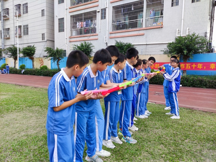 研討活動首先由課題主持人王武輝老師和課題組成員孫滔、朱四萍、陳浩芳、劉樂琴、鄭志權(quán)等五位老師圍繞“自由與規(guī)則”為主題開展德育拓展活動。他們主持的游戲分別為“桃花朵朵開”“珠行千里”“黑夜探索”。在每個游戲開展前導(dǎo)師都會詳細(xì)講解游戲規(guī)則。第一個游戲“桃花朵朵”,是一個熱身游戲,由陳浩芳老師主持。在陳老師的指導(dǎo)下,全班同學(xué)全身心投入,在操場上奔跑著、歡呼著、擁抱著,每一輪“落單”同學(xué)最后進(jìn)行才藝展示,學(xué)生們的活動熱情得到激發(fā)。第二個游戲“珠行千里”,相對于第一個游戲,具有一定的難度,考驗小組同學(xué)的團(tuán)結(jié)度,由鄭志權(quán)老師主持。在游戲分享環(huán)節(jié),學(xué)生們躍躍欲試,并紛紛表示規(guī)則很重要,小組同學(xué)之間一定要團(tuán)結(jié)。第三個游戲“黑夜探險”,這是三個游戲中難度系數(shù)最大,由王武輝老師主持。王老師在游戲開始前,給每一個學(xué)生分發(fā)一個眼罩,只有每組隊伍最后一位同學(xué)不用戴眼罩,整個游戲過程不能發(fā)出聲音,由導(dǎo)師帶領(lǐng)穿行預(yù)定的路線。游戲進(jìn)行前,小組長組織本組同學(xué)商量指令動作,游戲結(jié)束后,進(jìn)行游戲感受分享,在游戲中同學(xué)們感受到了小組同學(xué)規(guī)則、默契的重要性。