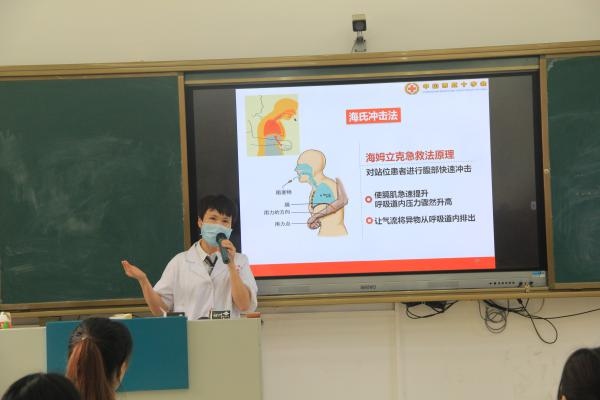 本次培訓主要由廣東省紅十字會急救培訓師、東鳳醫(yī)院健康教育科主任范蓮瑩主講,她以圖片及互動的教學方式為大家講解應急救助的流程、心肺復蘇和海姆立克法,強調救護“黃金四分鐘”的重要性,現(xiàn)場講師不僅進行了詳細地理論知識講解,還向師生們演示了大人氣道異物梗阻急救的方法——胸外按壓、海姆立克法等急救技術,醫(yī)生還以模擬橡膠人為器具,現(xiàn)場演示了正確的嬰兒氣道異物梗阻的急救方式。師生們聽得津津有味,并積極參與體驗操作。