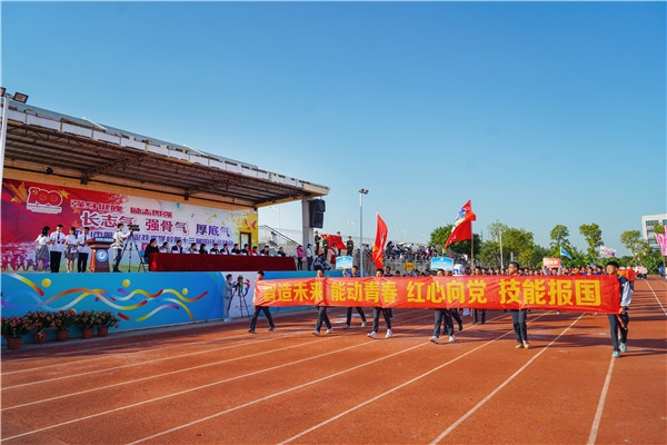 操場(chǎng)上彩旗招展,伴隨著激昂的運(yùn)動(dòng)員進(jìn)行曲,國(guó)旗護(hù)衛(wèi)隊(duì)、校旗護(hù)衛(wèi)隊(duì)、運(yùn)動(dòng)會(huì)會(huì)徽、彩旗方陣,裁判員方陣依次入場(chǎng)。由相同專業(yè)組合成的25個(gè)方陣穿上統(tǒng)一的服裝,排著整齊的隊(duì)伍,邁著矯健的步伐,英姿颯爽、神采飛揚(yáng),意氣風(fēng)發(fā)的走向主席臺(tái)接受檢閱。各方陣都在嘹亮的口號(hào)之后,結(jié)合專業(yè)建設(shè)進(jìn)行了主題鮮明、獨(dú)具匠心的才藝表演。節(jié)目形式多樣、精彩紛呈,有詩朗誦、有歌曲、有舞蹈、有情景劇、有舞獅……同學(xué)們用不同的形式展示專業(yè)技能、專業(yè)特色文化,充分體現(xiàn)了學(xué)生們的朝氣、斗志、團(tuán)結(jié)。