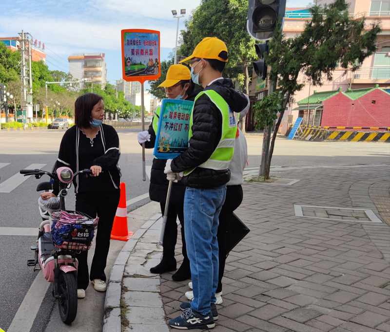 從11月起,不少市民留意到,中山市南頭鎮(zhèn)多個路口出現了一群醒目的身影:他們身穿熒光色志愿者馬甲,頭戴小黃帽,手舉勸導牌,勸告來來往往的摩托車、電動自行車駕乘人員遵守交通法規(guī),佩戴安全頭盔。