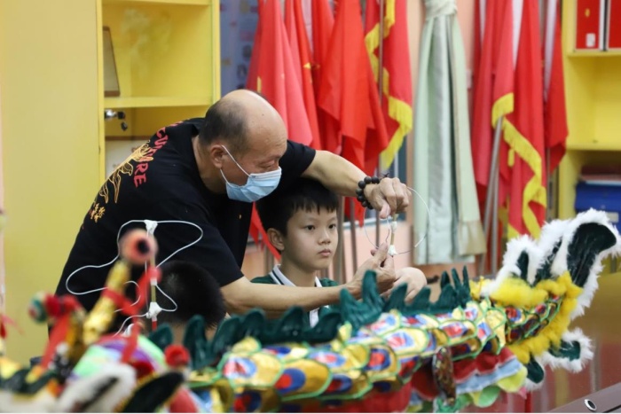 接著,水云軒小學(xué)黨支部書記、校長林小舟就學(xué)校非物質(zhì)文化遺產(chǎn)傳承起灣金龍扎作技藝的情況進(jìn)行總結(jié),他稱申報中山市非物質(zhì)文化遺產(chǎn)傳承基地結(jié)合“天時地利人和”,通過學(xué)校對起灣金龍扎作的普及推廣讓更多的孩子喜歡并傳承是十分有意義的事情。水云軒小學(xué)黃文燦副校長就學(xué)校開展傳承起灣金龍的相關(guān)活動進(jìn)行介紹。