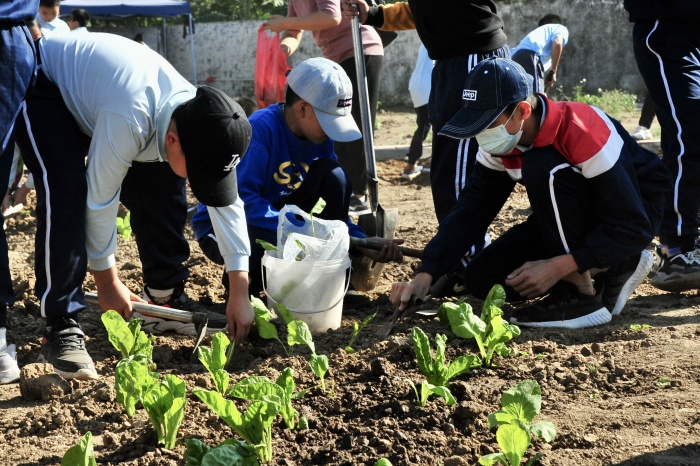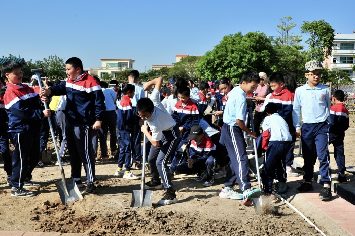 同學們有種植花卉的經(jīng)驗,可面對扎實堅硬的荒地,還是頭一次掄起翻土的鐵鍬呢。在家長和老師的示范下,同學們輪流學用沉重的鐵鍬翻地,大塊的泥頭被掘起,菜地里揚起一陣灰塵。同學們深知耕種不易,是實實在在的技術活和體力活。翻土之后就是整地,同學們用小的鋤頭把大塊的泥頭敲碎,在有種菜經(jīng)驗的家長的指導下起壟做畦,種下菜苗,澆水固根。