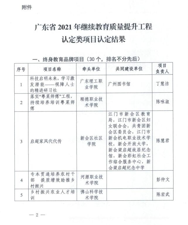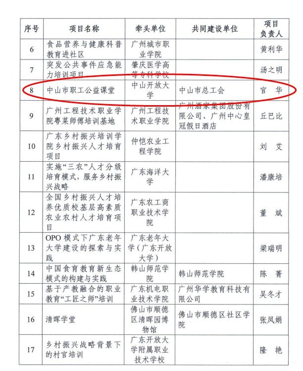 據(jù)悉,廣東省2021年繼續(xù)教育質(zhì)量提升工程認(rèn)定類項(xiàng)目共包括“終身教育品牌項(xiàng)目”和“全民學(xué)習(xí)之星”兩個(gè)子項(xiàng)目。全省共認(rèn)定“終身教育品牌項(xiàng)目”30個(gè),中山開放大學(xué)“中山市職工公益課堂”項(xiàng)目榮列其中。