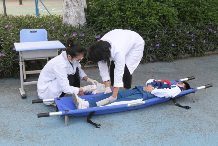 到達(dá)安全區(qū)域后,由各班班主任立刻清點(diǎn)人數(shù)層層上報(bào)。按照演練方案,行動(dòng)組發(fā)現(xiàn)一名學(xué)生“被困” 教室,指揮組組長(zhǎng)孫慧濤副校長(zhǎng)發(fā)出“請(qǐng)立即組織搜救”的指示,自救隊(duì)立即對(duì)“受傷被困”學(xué)生進(jìn)行救助。宿舍樓陽(yáng)臺(tái)“冒煙著火”(煙霧彈模擬), 1 名生活老師晃動(dòng)毛巾“呼救”,行動(dòng)組組長(zhǎng)孫慧濤副校長(zhǎng)立即做出行動(dòng)指示,指定保安人員打開(kāi)消防栓進(jìn)行滅火、拉好警戒線。同時(shí),報(bào) 119 請(qǐng)求支援。消防隊(duì)員迅速響應(yīng),駕駛消防車進(jìn)入校園開(kāi)展救援。同時(shí),“受傷被困”學(xué)生也被成功搜救出來(lái),到醫(yī)療救助點(diǎn)進(jìn)行包扎、檢查。