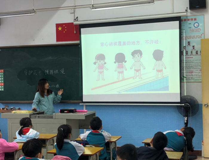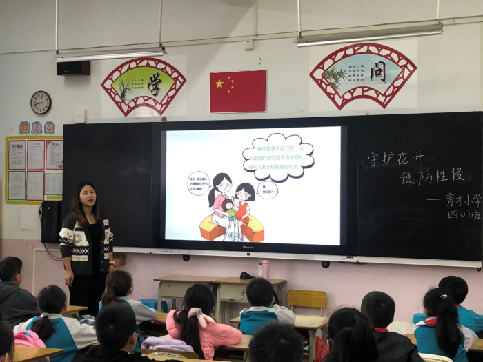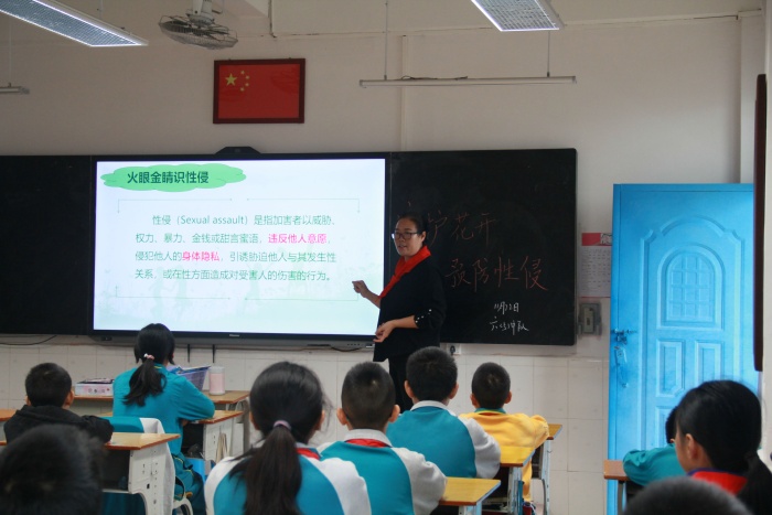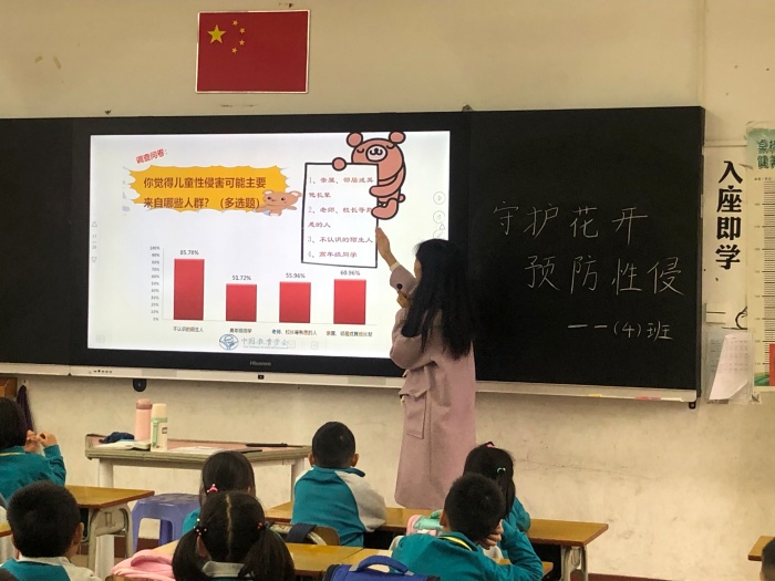 班會(huì)課上,老師借助多媒體輔助解說,與學(xué)生充分互動(dòng)交流,從“教孩子們認(rèn)識(shí)隱私部位”“教孩子們識(shí)別實(shí)施性侵害的伎倆”等,給學(xué)生上了一堂保護(hù)未成年人的性教育課程,讓學(xué)生建立了“隱私”的概念,學(xué)會(huì)如何保護(hù)自己和尊重別人的隱私部位等知識(shí)。接著,課堂引入小游戲“身體紅綠燈”教孩子們?nèi)绾伪鎰e壞人、保護(hù)自己,當(dāng)面臨正在實(shí)施的性侵害如何處理、遭遇性侵害后如何尋求幫助等問題展開學(xué)習(xí),讓孩子們提高警惕,增強(qiáng)防范意識(shí)。