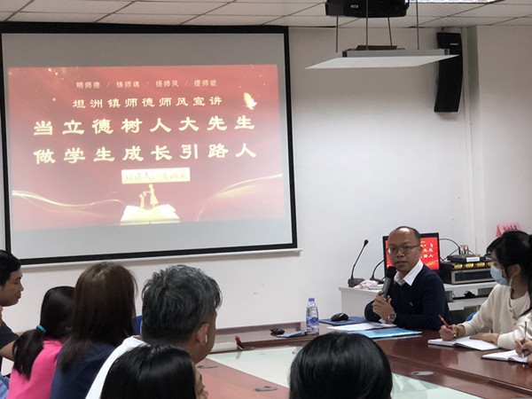 12月15日下午,我校有幸邀請到坦洲鎮(zhèn)宣講團(tuán)成員、十四村小學(xué)麥滿棠主任為我校教師作主題為“當(dāng)立德樹人大先生 做學(xué)生成長引路人”的專題講座。本次講座由王峰主任主持,全體教師聆聽學(xué)習(xí)。
