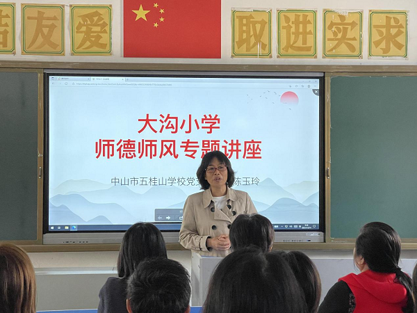14日上午,送教教師與大溝小學(xué)行政齊聚會議室,陳玉玲校長結(jié)合學(xué)校的基本情況、辦學(xué)理念、辦學(xué)特色等與大溝小學(xué)行政領(lǐng)導(dǎo)進行辦學(xué)理念研討,并作以“師者,以德為先”為主題的師德師風(fēng)專題講座。