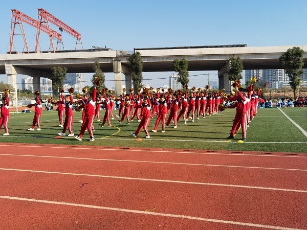 在激動(dòng)的掌聲后,所有人期待的啦啦操表演開始了!一二年級(jí)的《天使gogogo》,三四年級(jí)的《快樂的歌》,五六年級(jí)的《足球?qū)氊悺?,都秀出了各自的特色和精彩。六年?jí)的拉拉操表演秀《足球?qū)氊悺酚葹槲矍?,載歌載舞,有趣的隊(duì)型變換,引來了在場(chǎng)觀眾的陣陣喝彩。