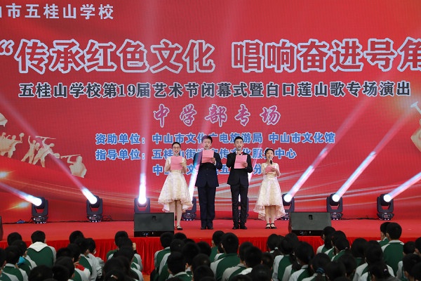 2021年12月31日一天,五桂山學(xué)校體育館內(nèi)歌舞飛揚(yáng),掌聲如潮,原來是五桂山學(xué)校在這里舉辦第19屆藝術(shù)節(jié)閉幕式暨白口蓮山歌專場演出。上午為小學(xué)兩個專場,下午為中學(xué)專場。
