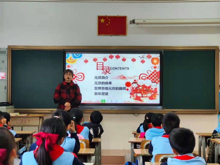 本次活動在各班班主任對學(xué)生衷心的新年祝福中開始,班主任寄語學(xué)生們在新的一年里身體健康,學(xué)習(xí)進步。簡單的語言,卻承載著老師最真心的祝福,同學(xué)們也紛紛用熱烈的掌聲表達對老師的感謝。緊接著,老師給學(xué)生講解了元旦相關(guān)的知識,如元旦的由來、世界各地的元旦習(xí)俗等等。