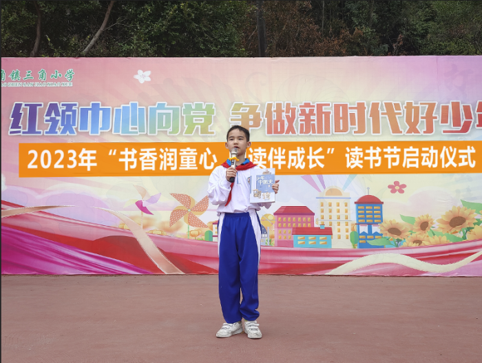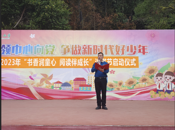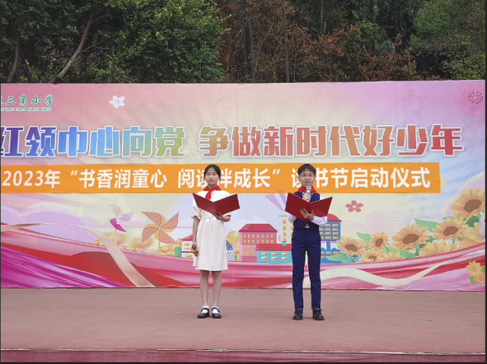 啟動(dòng)儀式第二項(xiàng),由三角小學(xué)副校長黃麗娟宣讀《三角鎮(zhèn)三角小學(xué)2023年“書香潤童心,閱讀伴成長”讀書節(jié)活動(dòng)方案》。黃副校長向全體同學(xué)發(fā)出倡議,號(hào)召同學(xué)們積極參加讀書節(jié)的各項(xiàng)活動(dòng),將知識(shí)運(yùn)用到學(xué)習(xí)及生活當(dāng)中,努力做到知行合一。