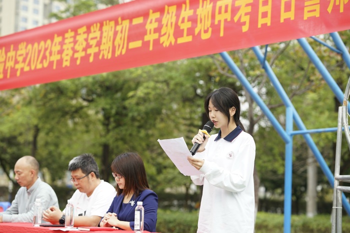 學(xué)生代表鄧玉彤同學(xué)認(rèn)為備戰(zhàn)生地中考的關(guān)鍵在于樹立目標(biāo),堅(jiān)定信心,努力奮斗和及時(shí)改進(jìn)學(xué)習(xí)方法。她堅(jiān)信初二學(xué)子必能以高昂的斗志、百倍的信心、扎實(shí)的基礎(chǔ),逐鹿考場(chǎng),笑傲六月。