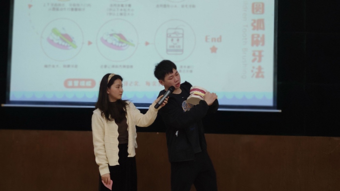 活動伊始,新聯(lián)小學校長吳肇葵感謝板芙鎮(zhèn)相關部門為學校師生帶來知識講座。他結合自身成長經歷告訴學生口腔保護以及毒品預防的重要性,提醒學生在講座中要認真傾聽。板芙醫(yī)院口腔科醫(yī)生羅睿用通俗易懂的語言為同學們科普了豐富有趣的口腔健康知識。他從口腔存在的普遍問題,窩溝齲的發(fā)展過程及口腔保健等多方面詳細闡述了口腔保健的重要性,并強調生活中要養(yǎng)成早晚刷牙、飯后漱口等良好的好習慣。然后,他還通過圖文和實物模型結合的形式為孩子演示正確的刷牙方式,同學們聽得津津有味,跟著羅睿醫(yī)生的步驟逐步學習正確、科學的刷牙方式。