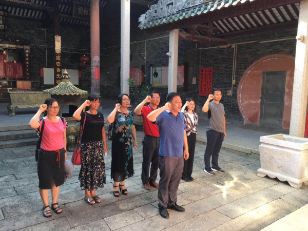 參觀完展板后,全體黨員教師在宗祠大門口集合,神采奕奕,在火紅的黨旗下緊握拳頭,莊嚴地重溫入黨誓詞。全體黨員教師表示一定不忘歷史,不忘初心,以革命前輩為榜樣,做好教育教學工作,為黨育人,為國育才。