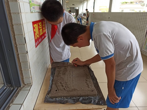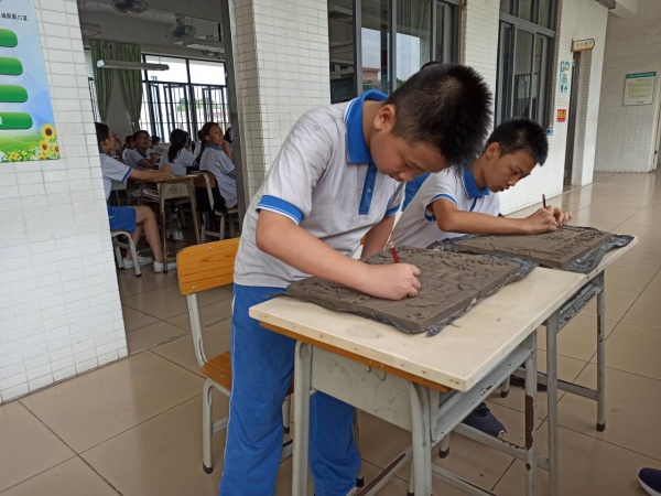在開展陶板簽名儀式前,每個班級已根據(jù)自己的班級特色和理念設(shè)計了一塊感恩主題的陶板。有的班級以學(xué)校的美麗景色或花草樹木為版面來歌頌和感恩學(xué)校;有的以老師輔導(dǎo)學(xué)生、幫助學(xué)生等元素歌頌師生情,感恩師長;有的以帆船遨游大海設(shè)計元素來表達(dá)對未來的憧憬;也有以人物的元素裝飾板面表現(xiàn)七彩童年……每一塊主題鮮明,裝飾豐富,各有特色。簽名活動中,孩子們在美術(shù)科組全體老師的指引下有秩序地排隊,小心翼翼地在陶板上刻上自己的名字,為母校留下永恒的印跡,這對于師生來說是一次非常有意義的活動,讓畢業(yè)充滿了儀式感。