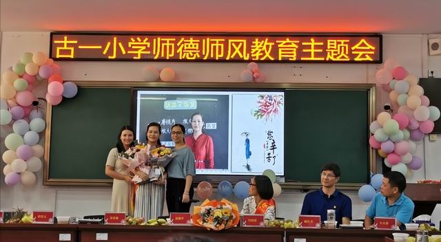 會議的第二議程為退休教師歡送會。首先,唐慧玉校長代表全體教職員工祝賀兩位老師光榮退休并為她們送上紀念品。緊接著各科組代表分別為三位老師獻花,獻上了最真摯的祝福與禮物。三位老師的徒弟也通過播放圖片的形式,回顧了三位老師在古一小學度過的時光,并對三位老師為學校建設所做的貢獻表示真摯的感謝。隨后,馮潤愛老師向與會教師分享了36年兢兢業(yè)業(yè)獻身教育的工作歷程。而蘇炎松老師樸素的發(fā)言,讓所有年輕老師更是深深感受到了一位退休教師對工作、對藝術追求的赤子之心,也表達了他對學校未來發(fā)展的美好憧憬和祝福。唐佩華老師提及自己幾十年的工作生涯感慨萬千,有對教育事業(yè)的深厚情感,也有對學校以及同事們的感謝和眷戀之情。時間本沒有特別意義,但長久沉淀的教學日常,讓教師的青蔥年華釀成了滿園的桃李芬芳。最后楊紅衛(wèi)校長用了十個字進行總結:感謝、感動、感激、期待與祝福,他對馮老師、蘇老師、唐老師仍為了學校教育教學工作的順利進行,繼續(xù)堅守在一線教學崗位,站好最后一班崗的這種奉獻精神表示真誠地感激和深深的敬意!學校的每一步發(fā)展、每一點成績都離不開他們曾經的汗水和付出,希望全體教師能夠把這種難得的愛崗敬業(yè)與無私奉獻的精神在古一小學繼續(xù)傳承下去。
