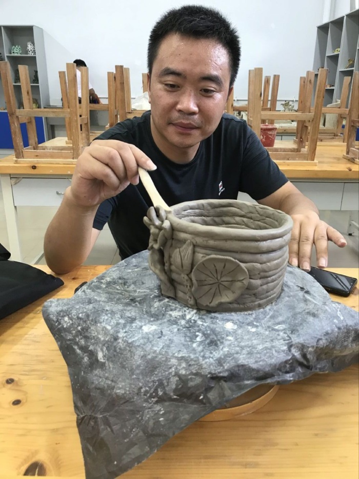 接著,林美婷老師給跟崗老師講解陶藝的技法,現(xiàn)場示范制作陶罐,跟崗教師以高漲、飽滿的熱情認真聆聽、細心地制作他們喜歡的陶藝作品,有的做實用陶罐,有的做動物泥玩具,有的做了一本有意義“陶書”,銘刻教育的初心……他們一邊做一邊積極地和陶藝老師互動交流,不斷汲取陶藝的知識,互相分享教育的經(jīng)驗心得。通過這次活動,跟崗教師從遠距離的校園文化觀摩到近距離的泥巴觸摸,再到一件件陶藝作品的呈現(xiàn),讓每位跟崗教師真切的感受到陶藝的樂趣,也感受到鎮(zhèn)南陶藝教師的熱情和專業(yè)水平,這樣特別的培訓和交流,也讓鎮(zhèn)南小學陶藝教師在教的同時收獲了友情。