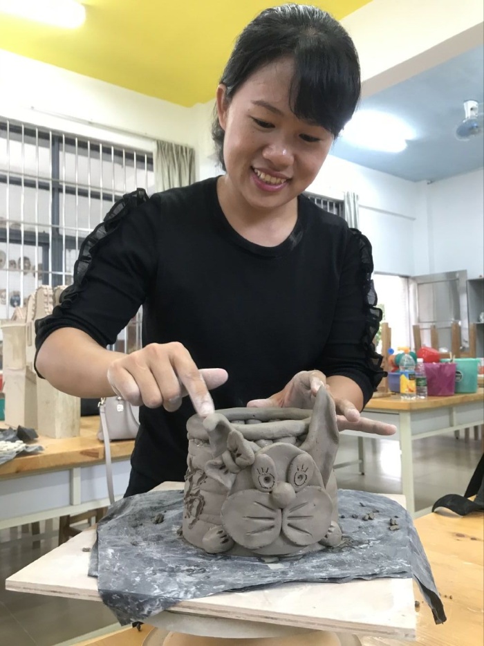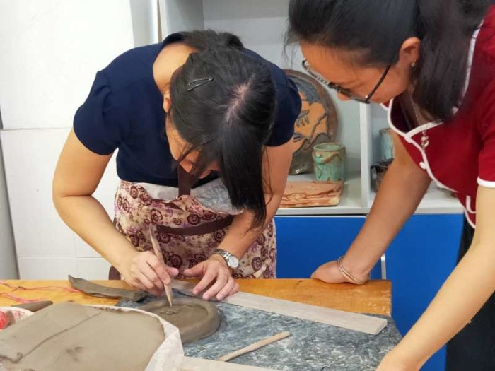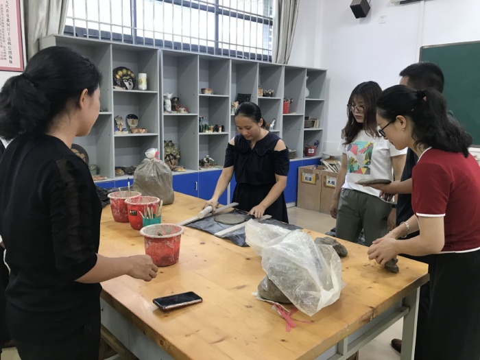 在學習制陶前,盧雅儀和林美婷老師向跟崗老師們介紹了學校的陶藝特色的發(fā)展狀況。兩位陶藝教師結(jié)合自己多年的陶藝教學工作經(jīng)驗,從學校陶藝的普及、社團的常規(guī)管理、活動計劃、課題引領(lǐng)等不同的方面進行詳細的講解,讓跟崗老師們對學校的陶藝特色發(fā)展有了深刻的了解。