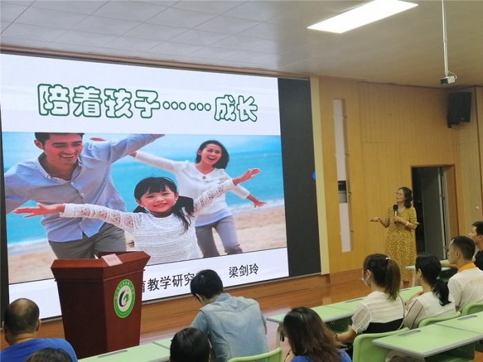 伴隨著掌聲,中山市教體局教研室心理健康教育教研員梁劍玲老師進(jìn)行了主題為“陪著孩子慢慢成長(zhǎng)”的講座,梁老師根據(jù)一年級(jí)學(xué)生的心理特點(diǎn),指出學(xué)生的心理水平還停留在不隨意性和具體形象階段,當(dāng)學(xué)生逐漸意識(shí)到“自己是一名小學(xué)生”時(shí),他的行為也會(huì)發(fā)生一些自覺(jué)性,讓他幫忙做一些事會(huì)很積極地響應(yīng),表明孩子開(kāi)始明白一些社會(huì)責(zé)任了。對(duì)于一年級(jí)學(xué)生,心理健康教育的目標(biāo)是:適應(yīng)新的環(huán)境,新的學(xué)習(xí)生活,樂(lè)與老師同學(xué)交往,初步建立人際關(guān)系;認(rèn)識(shí)角色任務(wù),培養(yǎng)積極樂(lè)觀的學(xué)習(xí)情趣,建立良好的行為習(xí)慣。同時(shí),梁老師還指出,在一年級(jí)孩子的成長(zhǎng)過(guò)程中,家長(zhǎng)們不能操之過(guò)急,要靜待花開(kāi),飽以滿分的期待對(duì)待成長(zhǎng)中的孩子。