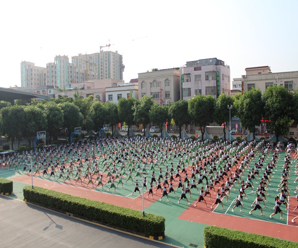 迎著朝陽,曹二小學30個班級千余名學子在大課間總指揮余洪芬老師強而有力的指令下迅速整齊集結。一個個方隊,伴著音樂,在余老師的指揮下,在操場上井然有序地跑動起來,時而交匯,時而分開,像足了游戲中的貪吃蛇。學生步調一致,喊著響亮的口號,場面尤其壯觀,同時還展現(xiàn)了氣勢如虹的武術操和動感十足的健美操,獲得了觀摩老師熱烈的掌聲,更是得到了慕名而來的順德容山小學體育老師們的贊譽。