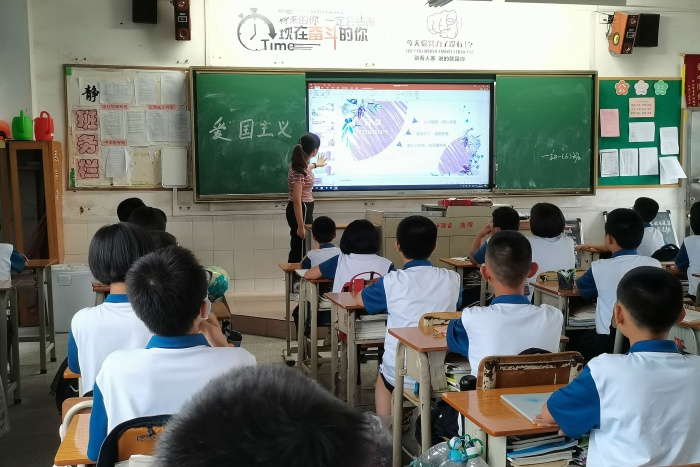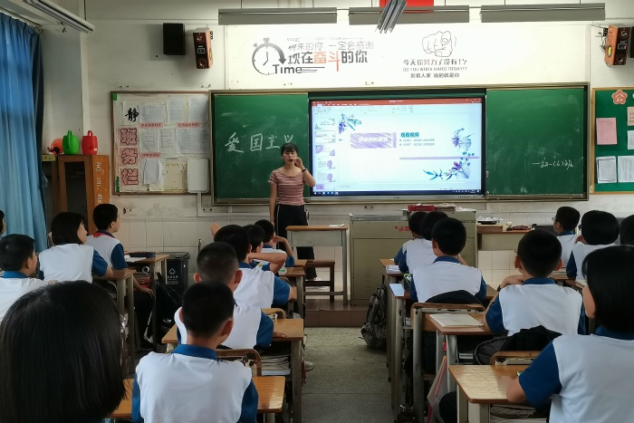 班主任毛茜老師首先提問學生,祖國在大家心里是什么含義?同學們紛紛發(fā)表了自己的看法。毛老師趁大家情緒漸佳,馬上展開了第一個流程,通過引入一些歷史上較為有名的愛國人士的故事,向同學們展現(xiàn)了什么是愛國。而后,毛老師詢問:為什么愛國呢?同學們通過實例深刻感受到“有國才有家,有家才有我”這雖然簡單但也道出真理的話語。中國現(xiàn)在生活環(huán)境能這么好,更應該值得大家去珍惜,去愛護。