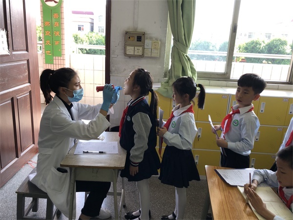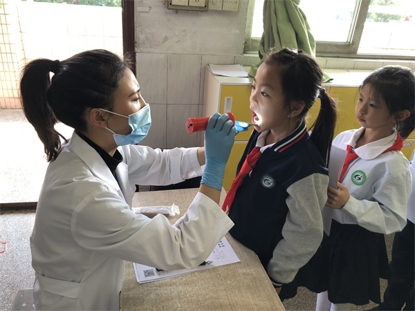 中環(huán)口腔門(mén)診的工作人員分別從牙列分期、蛀牙的內(nèi)涵以及產(chǎn)生原因、蛀牙的危害等多方面給同學(xué)們普及了口腔知識(shí)。隨后,工作人員還通過(guò)詼諧的言語(yǔ),生動(dòng)地講解了正確刷牙的方法。同學(xué)們聽(tīng)得津津有味,紛紛表示以后都會(huì)注意個(gè)人的口腔衛(wèi)生,爭(zhēng)做愛(ài)牙護(hù)牙小衛(wèi)士。宣講結(jié)束后,同學(xué)們意猶未盡。緊接著,工作人員耐心地給曹二小學(xué)的學(xué)生檢查口腔和牙齒,并根據(jù)他們的口腔情況告知其注意事項(xiàng)。檢查結(jié)束后,同學(xué)們?cè)诠ぷ魅藛T的帶領(lǐng)下,一起齊讀《護(hù)齒歌》,似乎在用整齊響亮的聲音來(lái)證明自己保護(hù)牙齒的決心。