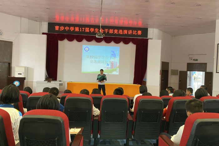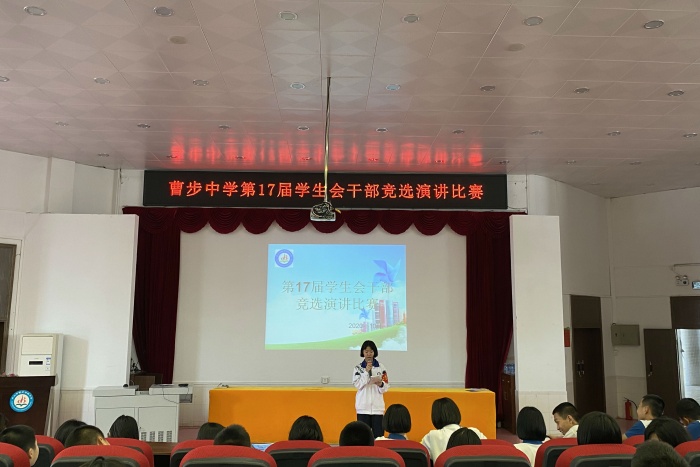 為了促進學生會的發(fā)展,培育并選拔第17屆優(yōu)秀的學生會干部,2020年10月21日中午,曹步中學召集全體學生會成員在一樓報告廳進行每人三分鐘的演講。演講的內(nèi)容為自己對一年來學生會生活的體會,以及自己準備競選的干部職位和打算。本次演講比賽由學生會指導老師賀坤主持。