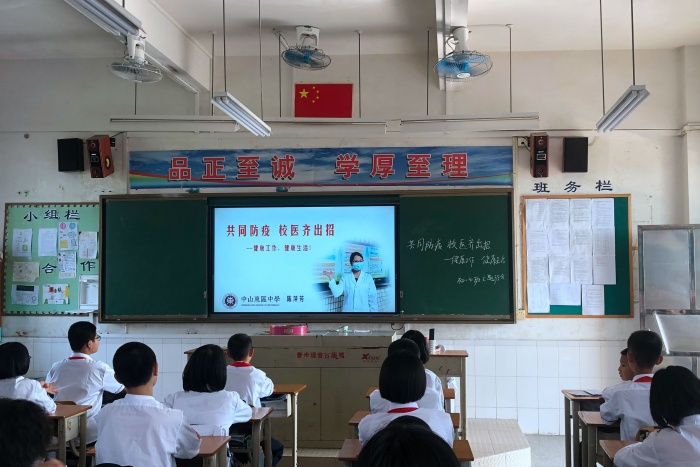班會伊始,班主任黃肖宇老師首先就近段時間的疫情防控作總結(jié),并強調(diào)同學(xué)們外出時仍要戴好口罩,保護好自己。接著黃老師播放了視頻《共同防疫,校醫(yī)齊出招——健康工作,健康生活》。