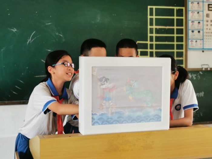 神秘而有趣的皮影戲帶來的是學生對制作皮影的渴望,而恰巧第三部分就室班主任引導同學們制作皮影并排練一部簡短的皮影戲。在觀看了同學們的皮影短劇之后,在班主任的幫助之下,同學們開始熱情高漲地制作他們自己的皮影,每一個小組的同學們都相互幫助,最終完成了自己的皮影并且開始小組皮影展示,每個小組的同學們都積極踴躍地展示著自己的皮影,而其他的同學們都給予了響亮的掌聲和鼓勵,這讓同學們在實踐中感受到皮影的有趣和魅力。