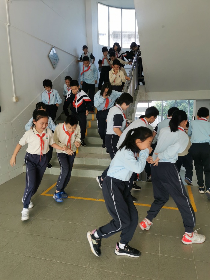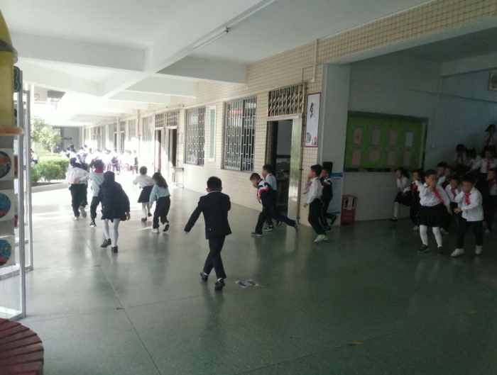 這一天早上,師生們?nèi)绯I险n,突然,校園的廣播系統(tǒng)響起了火災(zāi)預(yù)警音樂,聽到預(yù)警后,同學(xué)們快速地捂住鼻子,彎下腰,有序地從教室向指定的樓梯口跑向空曠的操場集合。
