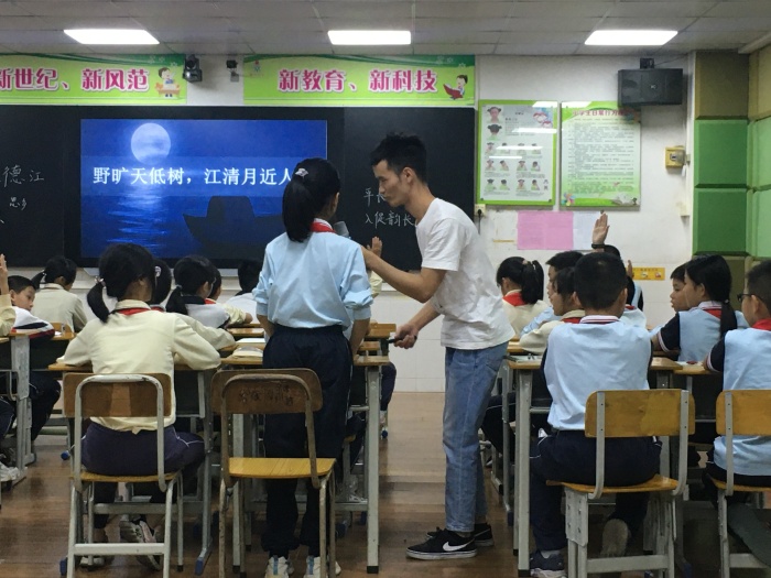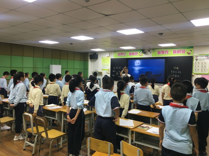 活動伊始,巫勇華老師帶領五(2)們的孩子們?yōu)榇蠹艺故玖艘还?jié)精彩生動的吟誦課例--《宿建德江》。在教學過程中,巫老師先帶領同學們理解詩意、想象詩句描繪的畫面。在想象中學習吟誦,在吟誦中體會詩人憂愁的情感。為了讓學生更好地學會吟誦,巫老師先讓學生了解平長仄短、入促韻長的讀誦方法,再漸漸引導學生掌握吟誦。在巫老師的啟發(fā)和引導下,學生在悠揚婉轉的吟誦中感悟詩情,以誦促情,且悟且誦。巫老師的經(jīng)典吟誦課生動、鮮活,在場的師生都被深深地吸引住了。
