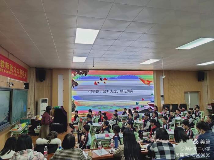 海洲第二小學的袁燕嫦老師參賽的課題是四年級下冊的《觀察物體》。她結合小組合作的教學模式,引導學生自主學習探索新知,結合視頻、實物、教具等讓學生直觀感受觀察物體,深化大教學觀小組合作的教育教學改革,在課堂上利用教學藝術,充分調(diào)動學生學習積極性,展示了新穎的教學方法。課堂氛圍生動活潑,取得良好教學效果。