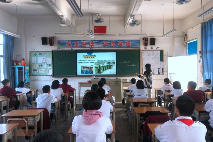 首先班主任黃肖宇老師向同學(xué)們介紹了垃圾日常的處理方式:衛(wèi)生填埋、焚燒、堆肥、資源返還。聽(tīng)了老師的介紹,同學(xué)們?nèi)粲兴迹涸瓉?lái)平日最不留意的、隨手丟棄的垃圾,對(duì)環(huán)境還有這么重要的影響,垃圾分類真的很有必要!