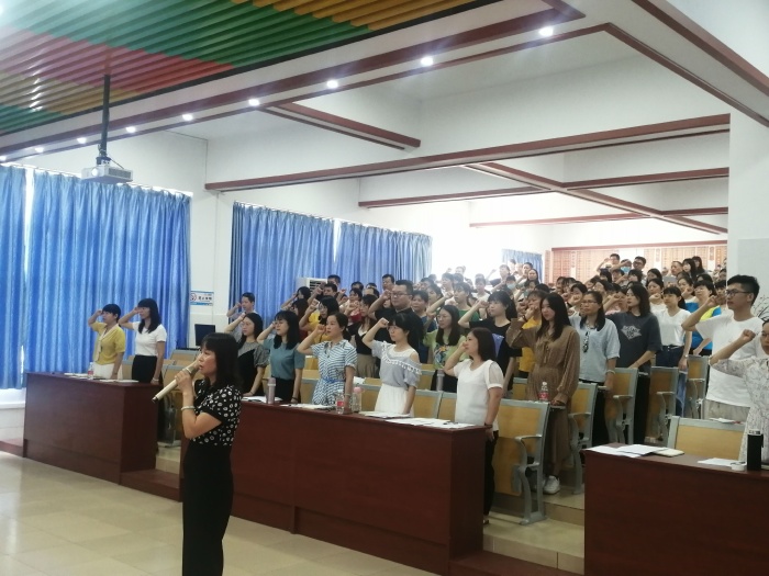解讀完畢,在歐慧芳的組織下,全體老師起立,舉起右手,莊嚴(yán)地進(jìn)行了師德承諾宣誓。頓時(shí),響亮整齊的聲音在階梯室上室回響,表達(dá)了老師們不僅用語(yǔ)言承諾、還將用行動(dòng)實(shí)踐的信心和決心。