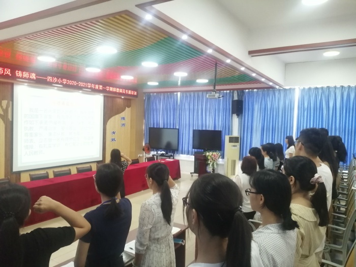 “我是一名光榮的人民教師,我在莊嚴(yán)的國(guó)旗下宣誓:我自愿在師德師風(fēng)方面作如下承諾:熱愛(ài)教育,關(guān)心學(xué)生;依法執(zhí)教,嚴(yán)謹(jǐn)治學(xué)……”9月8日下午,四沙小學(xué)階梯室里傳來(lái)響亮整齊的朗讀聲——原來(lái),該校全體教師正在校長(zhǎng)歐慧芳的帶領(lǐng)下莊嚴(yán)地進(jìn)行師德承諾。