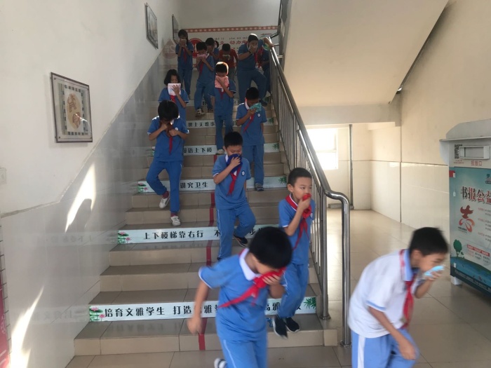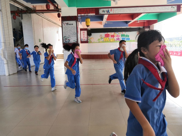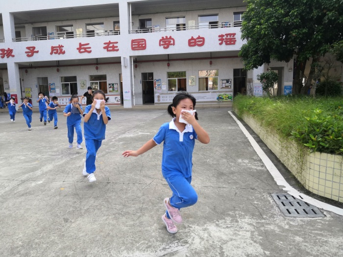 上午8時(shí)40分,“嗚嗚嗚……”一陣陣急促的警報(bào)聲在校園內(nèi)響起。各班課室里正在上課的師生們立刻停下了教學(xué)和學(xué)習(xí)活動(dòng),在上課老師的組織下有序地從各班課室里疏散出來,沿著平時(shí)指定的路線奔向田徑場(chǎng)。警報(bào)聲響起時(shí),在思齊樓前樓三樓最西邊的三4班正在上語文課。聽到警報(bào)聲,學(xué)生們立刻在老師的指揮下,跑出課室,沿著走廊向東跑,到了三8班課室后門,再向北拐穿過連廊。連廊的盡頭是機(jī)房。同學(xué)們?cè)跈C(jī)房前再沿走廊向東拐,下樓梯,繞過一樓花圃,按照指定的路線繼續(xù)向田徑場(chǎng)跑去……