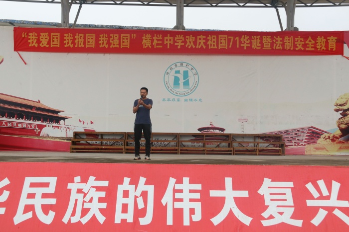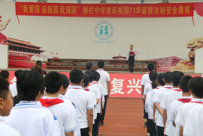為了慶祝偉大祖國(guó)母親的生日,同時(shí)也為了能讓全體師生過(guò)一個(gè)平安、愉快的國(guó)慶小長(zhǎng)假,9月28日,橫欄中學(xué)全體師生集中運(yùn)動(dòng)場(chǎng),舉行了“我愛國(guó),我報(bào)國(guó),我強(qiáng)國(guó)”歡慶祖國(guó)71華誕暨法制安全教育活動(dòng)。