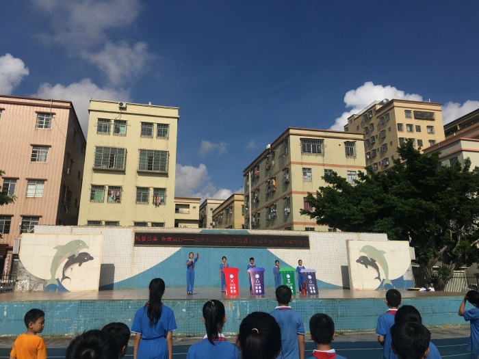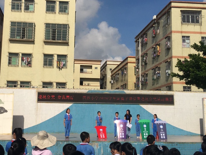 垃圾分類工作是創(chuàng)建文明城市的重要一環(huán)。為努力推進四沙小學垃圾分類工作,樹立綠色低碳、環(huán)保的生活理念,美化居住環(huán)境,減少污染,變廢為寶,9月30日上午,四沙小學利用大課間時間,全體師生一同集中田徑場觀看《垃圾分類,你我同行》情景劇。