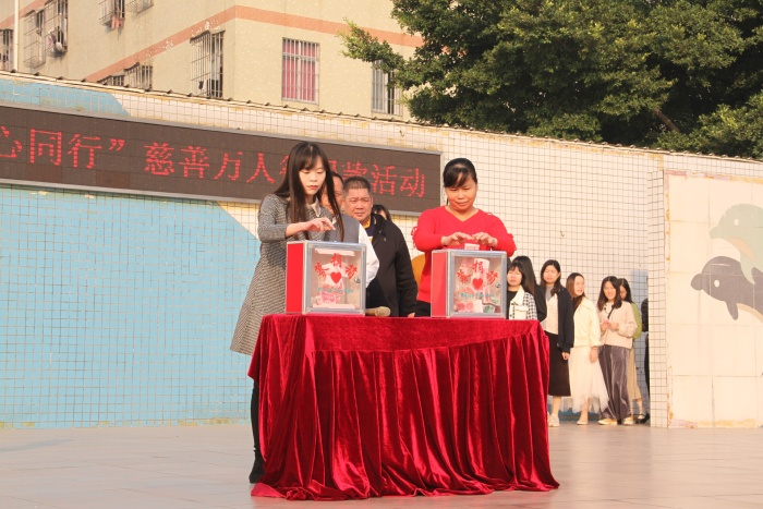 學(xué)校少先隊(duì)大隊(duì)副大隊(duì)輔導(dǎo)員梁佩珊作了簡(jiǎn)單的捐款動(dòng)員,號(hào)召全體師生積極傳承博愛精神,繼承和發(fā)揚(yáng)孫中山先生天下為公、無(wú)私奉獻(xiàn)的博愛情懷,獻(xiàn)出自己的愛心,踴躍捐款,為橫欄的慈善事業(yè)作出自己的貢獻(xiàn)。接著,在《愛的奉獻(xiàn)》樂曲聲中,捐款活動(dòng)正式開始。首先走向捐款箱是該校校長(zhǎng)歐慧芳帶領(lǐng)的行政團(tuán)隊(duì),當(dāng)一張張帶著愛心的百元大鈔投入捐款箱時(shí),臺(tái)下也同時(shí)響起經(jīng)久不息的掌聲。跟在行政團(tuán)隊(duì)后面捐款的依次是數(shù)學(xué)科組、語(yǔ)文科組、英語(yǔ)科組和綜合科組的老師們。全部老師捐款完畢后,接著是各班的學(xué)生代表進(jìn)行捐款。各班的學(xué)生代表們手拿全班的捐款,在捐款箱前大聲地報(bào)出了班級(jí)和捐款的總數(shù)。“大家好!一10班共捐款2000元,謝謝大家!”“大家好!二9班共捐款1521.2元,謝謝大家!”……此時(shí)此刻,田徑場(chǎng)上歌聲、掌聲匯成了一股寒冬里愛的暖流,在校園里流淌。