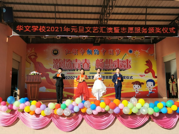 時(shí)光流淌辭舊歲,萬象更新賀新年。為豐富學(xué)校文化生活,給華文學(xué)子搭建一個(gè)培養(yǎng)能力、展示才華的舞臺(tái),激發(fā)學(xué)生熱愛生活、熱愛學(xué)習(xí)、熱愛校園的情感,提高學(xué)生的全面素質(zhì),華文學(xué)校于12月31日上午舉行2021年元旦文藝匯演暨志愿服務(wù)頒獎(jiǎng)儀式。