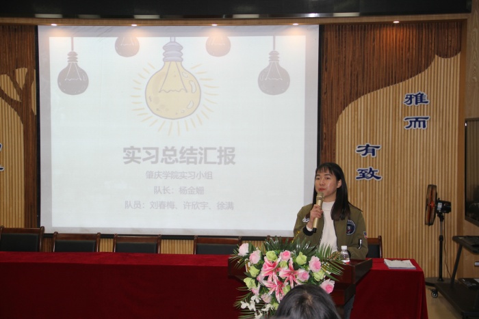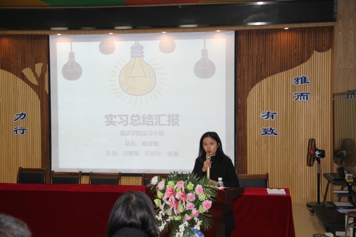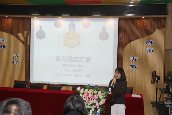 歡送會(huì)上,隊(duì)長(zhǎng)楊金珊老師代表實(shí)習(xí)小組作了實(shí)習(xí)總結(jié)發(fā)言。以時(shí)間為順序,她展示了大家在四沙小學(xué)所經(jīng)歷過(guò)的“第一次”,展現(xiàn)了她們第一次以教師身份過(guò)教師節(jié),第一次獨(dú)立上課,第一次家訪,第一次參加教研活動(dòng)……每一個(gè)第一次,都記錄著學(xué)校行政教師對(duì)他們的關(guān)心和幫助,都記錄著她們自身的努力和進(jìn)步。她們深深感謝四沙小學(xué)這塊沃土、溫暖的大家庭,給了她們成長(zhǎng)的機(jī)會(huì),給了她們發(fā)展的平臺(tái),使她們得到了鍛煉和成長(zhǎng)。緊接著,其他隊(duì)員許欣宇、劉春梅和徐滿(mǎn)老師也先后從自身的感受出發(fā),分享了她們?cè)谒纳承W(xué)短短的幾個(gè)月來(lái)學(xué)習(xí)、工作和生活的點(diǎn)點(diǎn)滴滴,再現(xiàn)了她們成長(zhǎng)的心路歷程,表達(dá)了她們對(duì)四沙小學(xué)和全體師生們的感激之情。