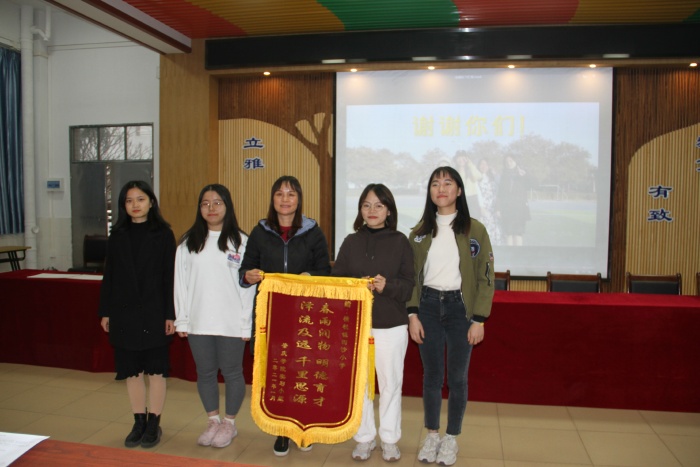 在熱烈的掌聲中,實(shí)習(xí)小組向四沙小學(xué)贈(zèng)送了上書(shū)“春雨潤(rùn)物明德育才 澤流及遠(yuǎn)千里思源”錦旗。四沙小學(xué)歐慧芳校長(zhǎng)也代表學(xué)校向她們頒發(fā)了“優(yōu)秀頂崗老師”榮譽(yù)證書(shū),表達(dá)了學(xué)校對(duì)她們幾個(gè)月來(lái)為四沙小學(xué)所作貢獻(xiàn)的充分肯定,并祝愿她們能把在四沙小學(xué)的學(xué)習(xí)工作經(jīng)歷當(dāng)作人生旅途中的一筆財(cái)富,為日后早日踏上教書(shū)育人講壇、成為一名光榮的人民教師做準(zhǔn)備。