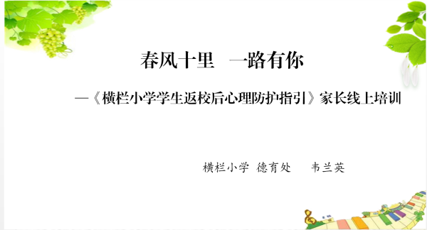 為加強(qiáng)疫情防控期間學(xué)校和家長之間的聯(lián)系,將學(xué)校教育與家庭教育有機(jī)結(jié)合起來,凝聚教育合力,共同引導(dǎo)學(xué)生健康成長,6月2日晚,橫欄小學(xué)德育處組織全校召開了“春風(fēng)十里,一路有您”為主題的學(xué)生返校后心理防護(hù)指引家長會(huì),此次家長會(huì)由德育處主任韋蘭英進(jìn)行授課。