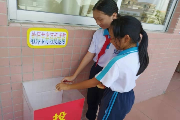 首先,由學(xué)生代表曾奕涵、梁杰穎給全體教師獻(xiàn)詞,用溫馨的話語表達(dá)真摯的情感,向老師們說出誠心的感謝和衷心的祝福。學(xué)生代表黃海盈為全體教師獻(xiàn)歌《梨花又開放》,最后隊(duì)干部為全體老師獻(xiàn)花,送上祝福。在各個班級上,少先隊(duì)員們把親手做的花、充滿愛意的賀卡獻(xiàn)給親愛的老師,向老師們表達(dá)全體同學(xué)最崇高的敬意。祝所有的老師工作順利,身體健康,永遠(yuǎn)年輕。