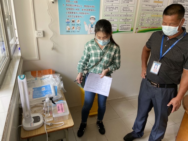 首先,督查組在三沙小學(xué)游學(xué)偉校長(zhǎng)、黃燕芬副校長(zhǎng)的陪同下,檢查了衛(wèi)生觀察室、健康觀察室、各班級(jí)教室等室場(chǎng)。在檢查衛(wèi)生觀察室的時(shí)候,冼景文副科長(zhǎng)指出衛(wèi)生觀察室外要有警戒線,不得讓非觀察學(xué)生隨便靠近;在檢查健康觀察室的時(shí)候,督查組成員提出了各種細(xì)致的問題:健康觀察室有沒有衛(wèi)生間,有沒有配備消毒液,一天消毒多少次,如果有學(xué)生發(fā)燒怎么辦等。督查組成員檢查了衛(wèi)生間、消毒液等,相關(guān)負(fù)責(zé)人解答了督查組的問題;在檢查教室的時(shí)候,督查組成員何淑鎂檢查了教室的桌椅布置、疫情防控物資箱、污染物應(yīng)急處置包等。
