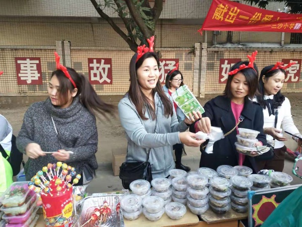 義賣活動(dòng)前,各班的老師、家長、同學(xué)正有條不紊地搬運(yùn)物品,整理攤位。瞧!那制作精美的海報(bào),那琳瑯滿目的物品,那令人垂涎三尺的美食,還有那創(chuàng)意十足的展臺(tái)……到處都洋溢著濃烈的義賣市場的氣氛。到了三點(diǎn)半,義賣準(zhǔn)時(shí)開始啦!頓時(shí),操場上熱鬧起來了,到處是拿著錢包、滿是期待的同學(xué)們。各個(gè)攤位前都圍滿了顧客,家長售貨員和學(xué)生售貨員有的笑容可掬,靜靜地等待著顧客的光顧;有的扯著嗓子大聲叫賣;還有一些搞起了大甩賣,買一贈(zèng)一,低價(jià)處理。孩子們忙著在各個(gè)展臺(tái)間不停穿梭,東張張西望望,生怕好東西都被搶購?fù)炅?。而這次最搶手的,無疑是五花八門的、色香味俱全的美食啦!只見各個(gè)美食攤檔前盡是人頭攢動(dòng),川流不息。其中,三沙小學(xué)游學(xué)偉校長開的云吞攤檔生意最是火爆,學(xué)生顧客和家長顧客在攤檔前排起了長龍,等著購買游學(xué)偉校長做的云吞。游學(xué)偉校長盡管都忙不過來了,卻樂得合不攏嘴。在這個(gè)暖意濃濃的下午,同學(xué)們在笑聲中買到了自己想要的商品,收獲了一下午的快樂時(shí)光,最重要的是,獻(xiàn)出了自己的一份愛心。