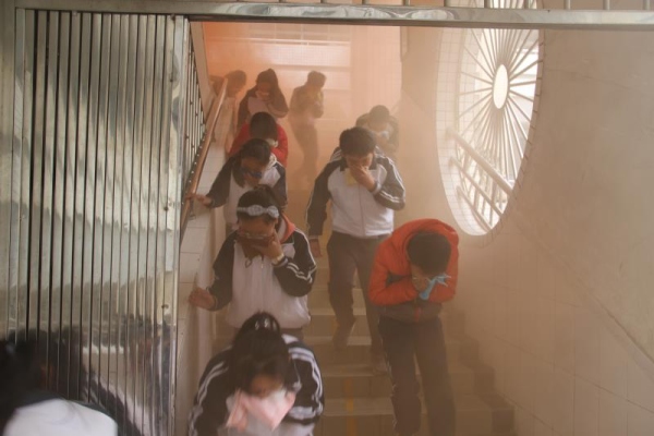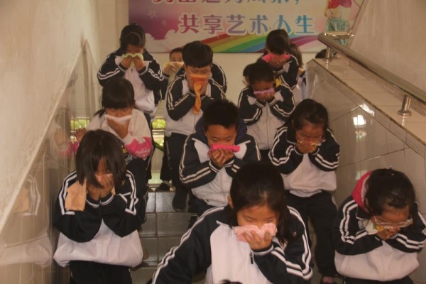 8點(diǎn)40分,安全管理員通過(guò)廣播提醒師生們演練的要求以及注意事項(xiàng)。隨后8點(diǎn)43分,教學(xué)樓二樓東面走廊冒出滾滾濃煙,“火災(zāi)”發(fā)生了!火災(zāi)警報(bào)馬上響起,提醒師生迅速撤離到足球場(chǎng)。各班上午第一節(jié)的上課老師馬上組織學(xué)生快速集合,并用毛巾捂住口鼻,按照既定疏散路線迅速有序地跑下樓梯,到達(dá)田徑場(chǎng)集中。隨后各班體育委員清點(diǎn)本班人數(shù)并向班主任匯報(bào)。