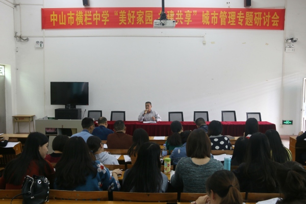 2019年12月16日下午,橫欄中學在學校階梯室以 “城市管理大家談”的形式開展了“美好校園共建共享”城市管理專題研討會。該研討會的召開,一是要積極響應中山市及橫欄鎮(zhèn)創(chuàng)文工作領導小組辦公室的號召,二是進一步加強師生愛校意識,建設美麗校園,為營造共建共治共享的城鎮(zhèn)治理格局貢獻一份力量。此次專題研討會由橫欄中學分管德育工作的工會主席黃富榮主講。學校德育處副主任陳冬華、麥潤洪、陳倫全、全體德育級長以及全校班主任參與此次研討活動。
