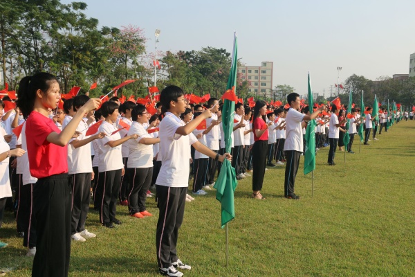 接著,由橫欄中學(xué)周碩、李青梅、李廣明、王輝南四位老師深情合唱的《紅旗飄飄》迅速點(diǎn)燃了現(xiàn)場(chǎng)的氣氛。隨后,由全體師生齊聲高唱《歌唱祖國》和《我和我的祖國》這兩首愛國歌曲。整齊的方陣、絢麗的色彩、嘹亮的歌聲響徹了橫中校園。“我和我的祖國,一刻也不能分割,無論我走到哪里,都流出一首贊歌”正表達(dá)著每一位師生對(duì)祖國的深情祝福和濃濃的愛國情懷?;顒?dòng)最后在象征喜慶、祝福和希望的醒獅表演和“祖國萬歲”的歡呼聲中圓滿結(jié)束。